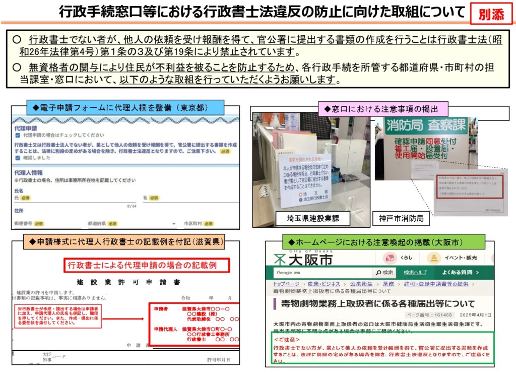 令和7年6月13日付で発出した各府省官房長等・都道府県知事宛て改正法公布通知において、各行政手続の所管部局においては、別添の地方公共団体における取組も参考としながら、行政書士又は行政書士法人でない者による関与を防止するための取組を行っていただくよう依頼しました。