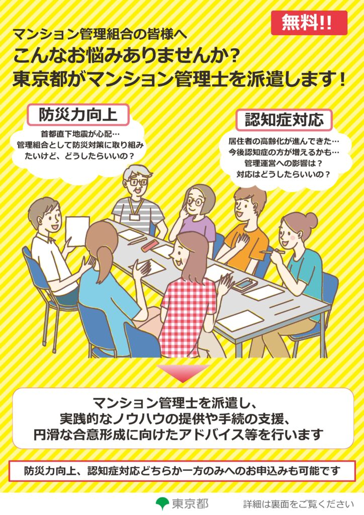 こうしたことを踏まえ、都は令和5年度から、防災力向上や認知症対応に取り組む管理組合を支援するため、下記のとおり、マンション管理士の派遣を行っています。